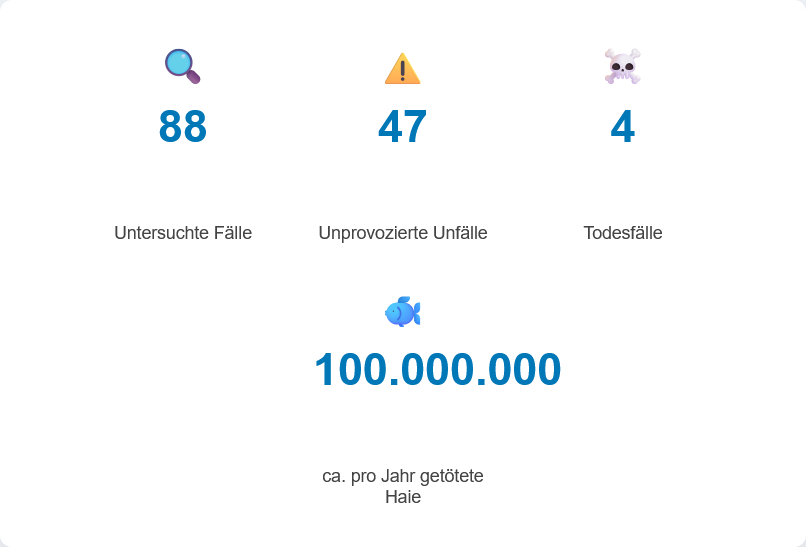 Die Anzahl der tödlich verlaufenen Haiangriffe weltweit im Jahr 2023. Diese Zahl ist in den letzten Jahrzehnten deutlich gesunken, was vor allem besserer medizinischer Versorgung und mehr Aufklärung zu verdanken ist.